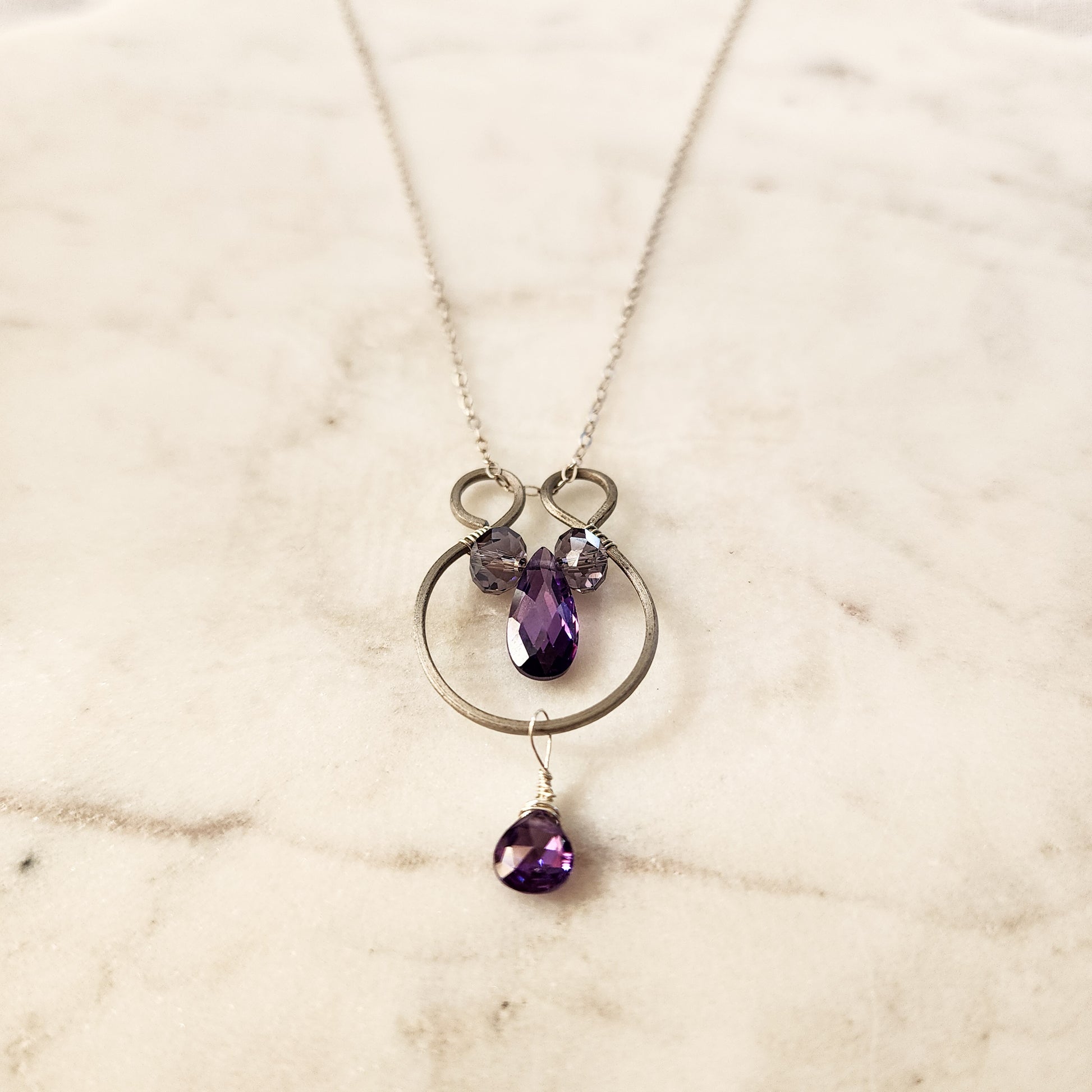 A radiant amethyst teardrop rests within hand-forged curves, kissed with a smoke-grey titanium accent and suspended from an 18" sterling silver chain. Quietly bold, this piece carries the August Embers spirit—moonlit, modern, and a little bit magical.