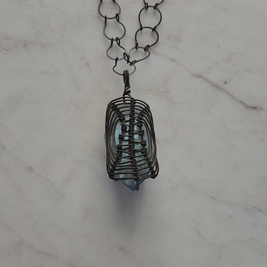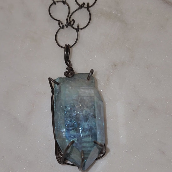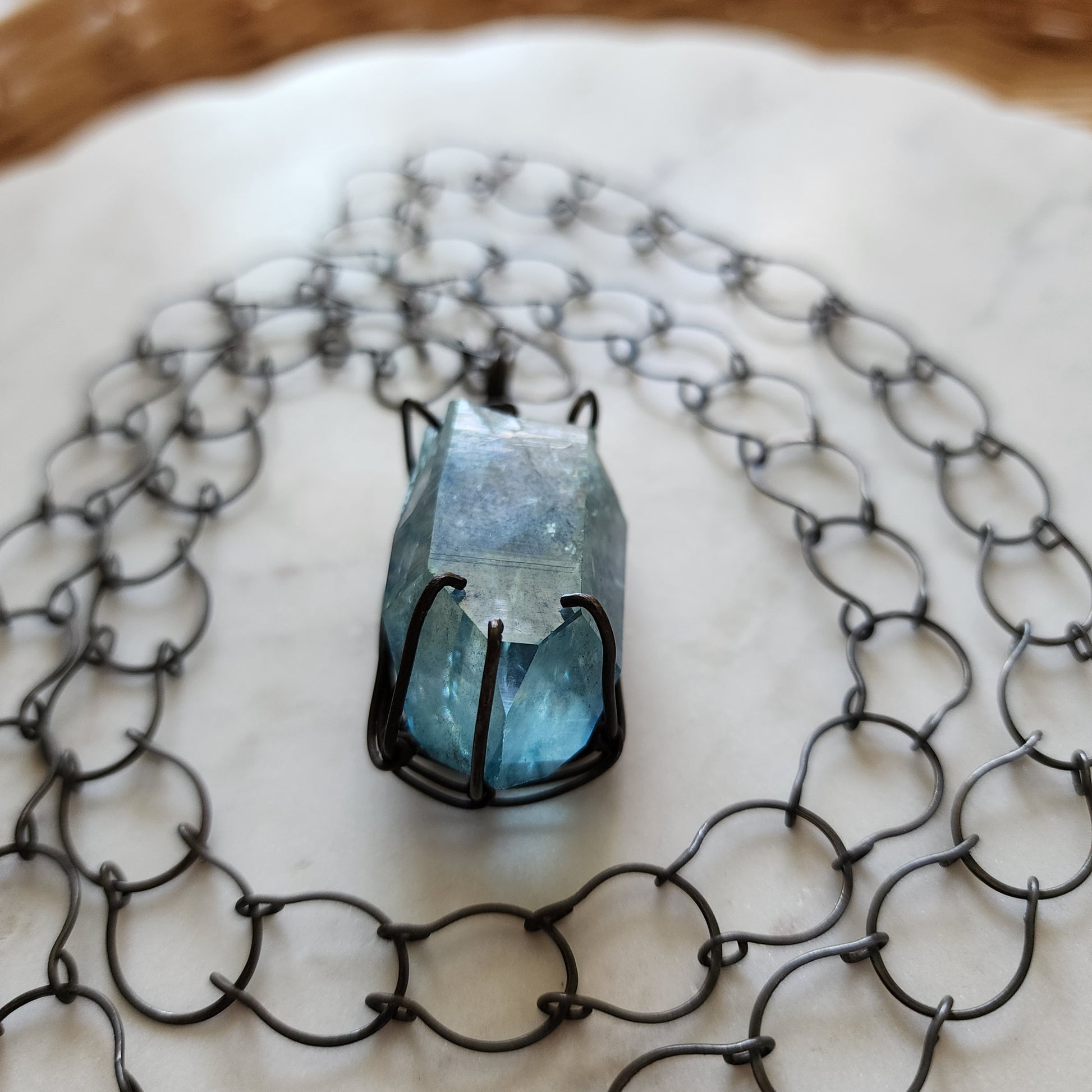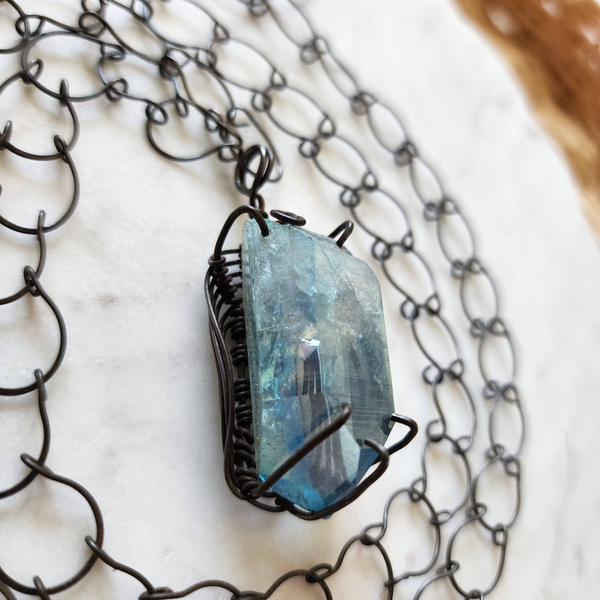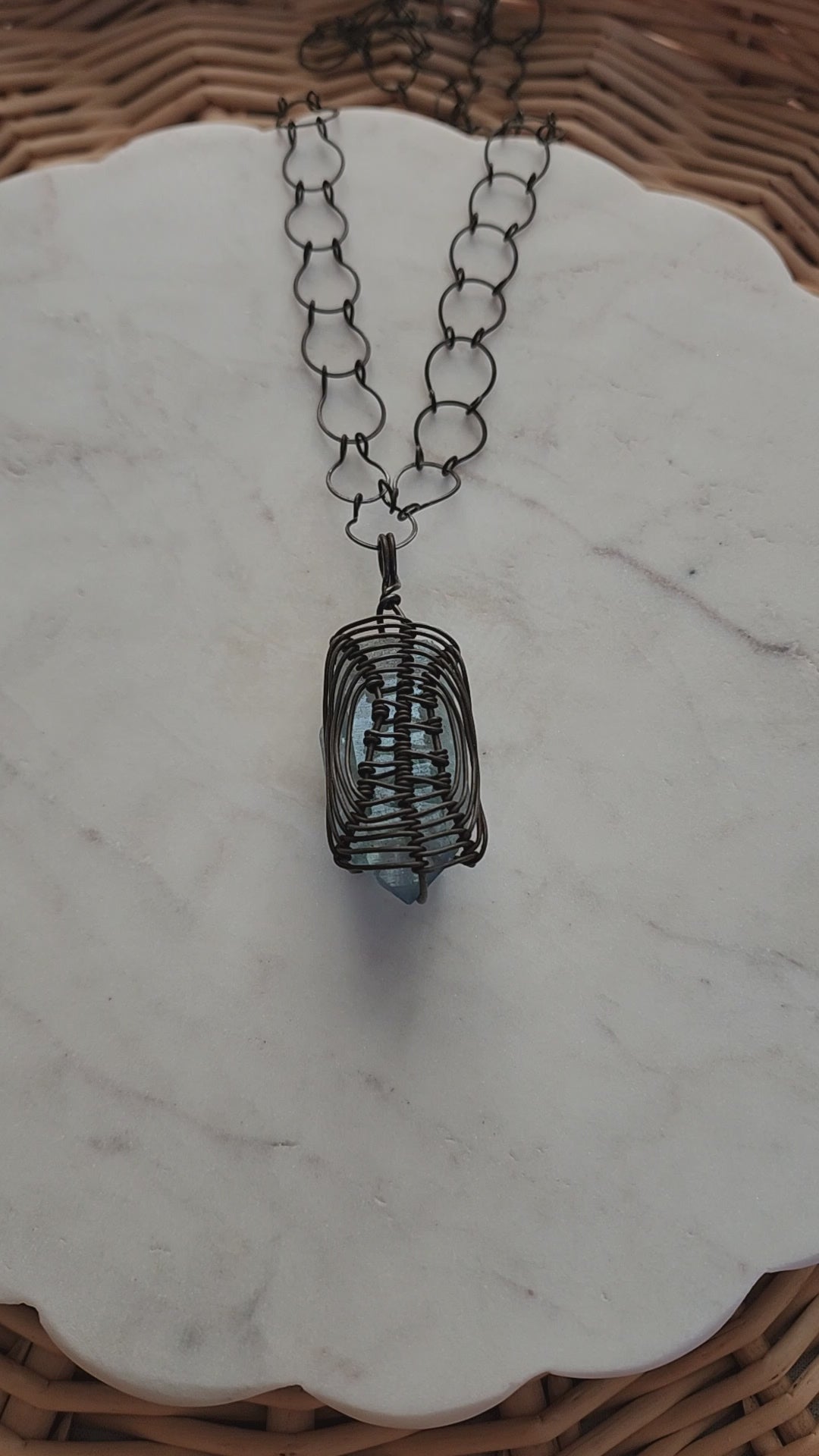 - Pendant: wrapped aqua aura crystal secured in oxidized iron