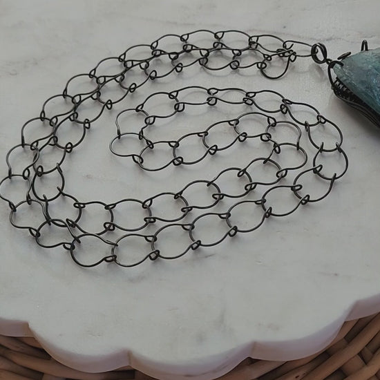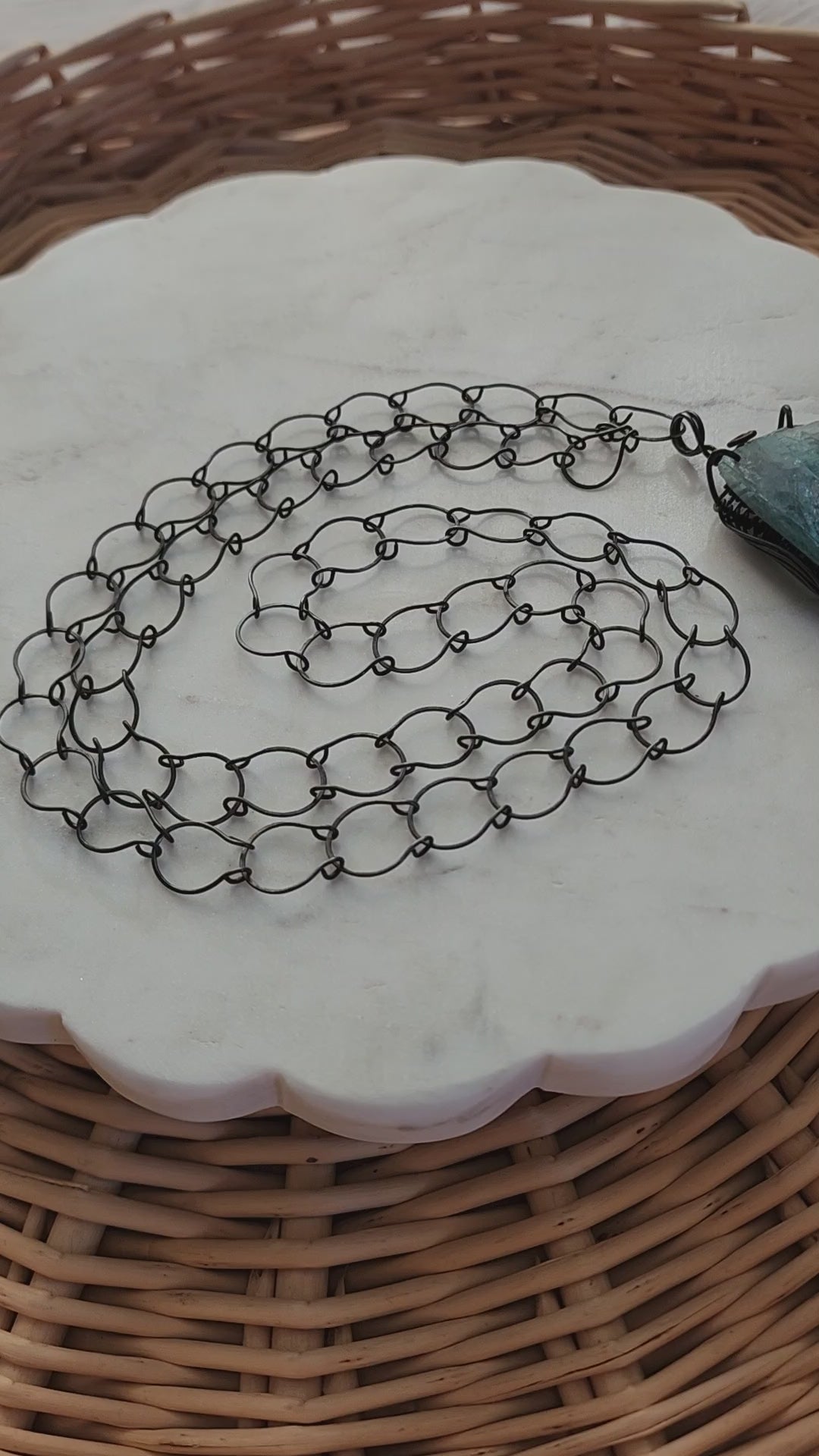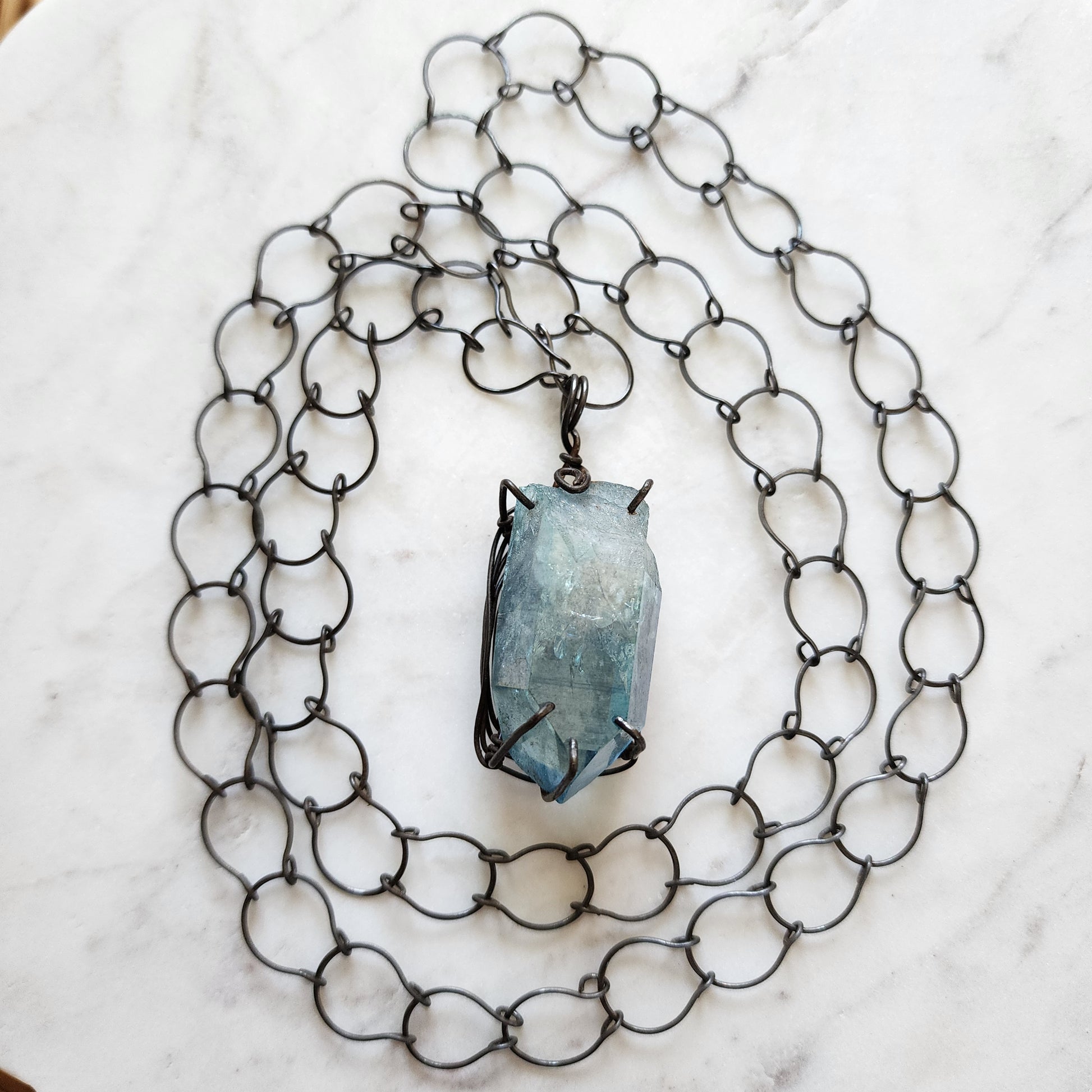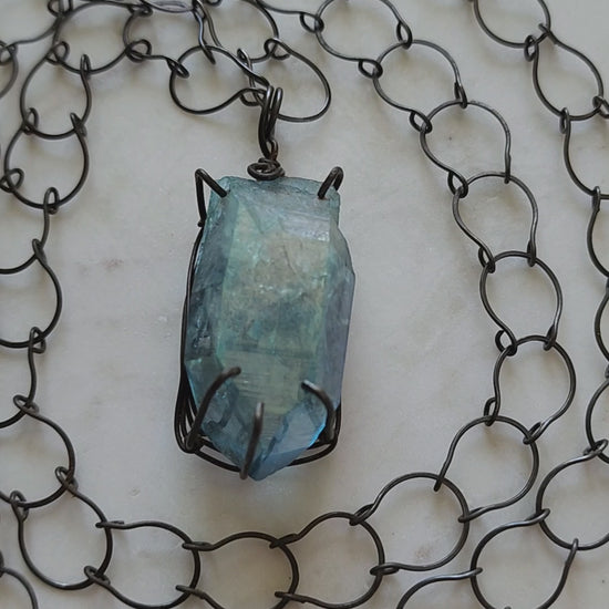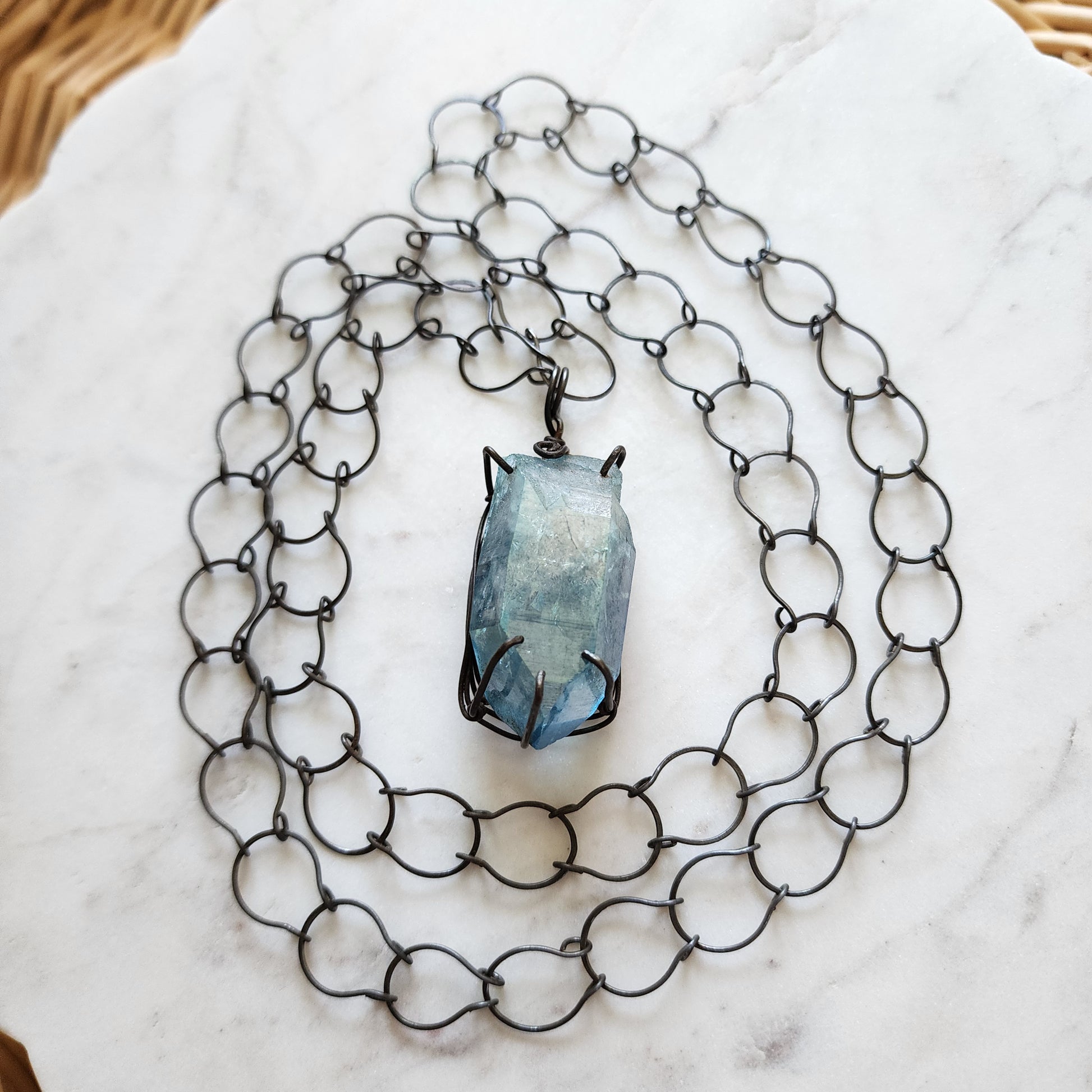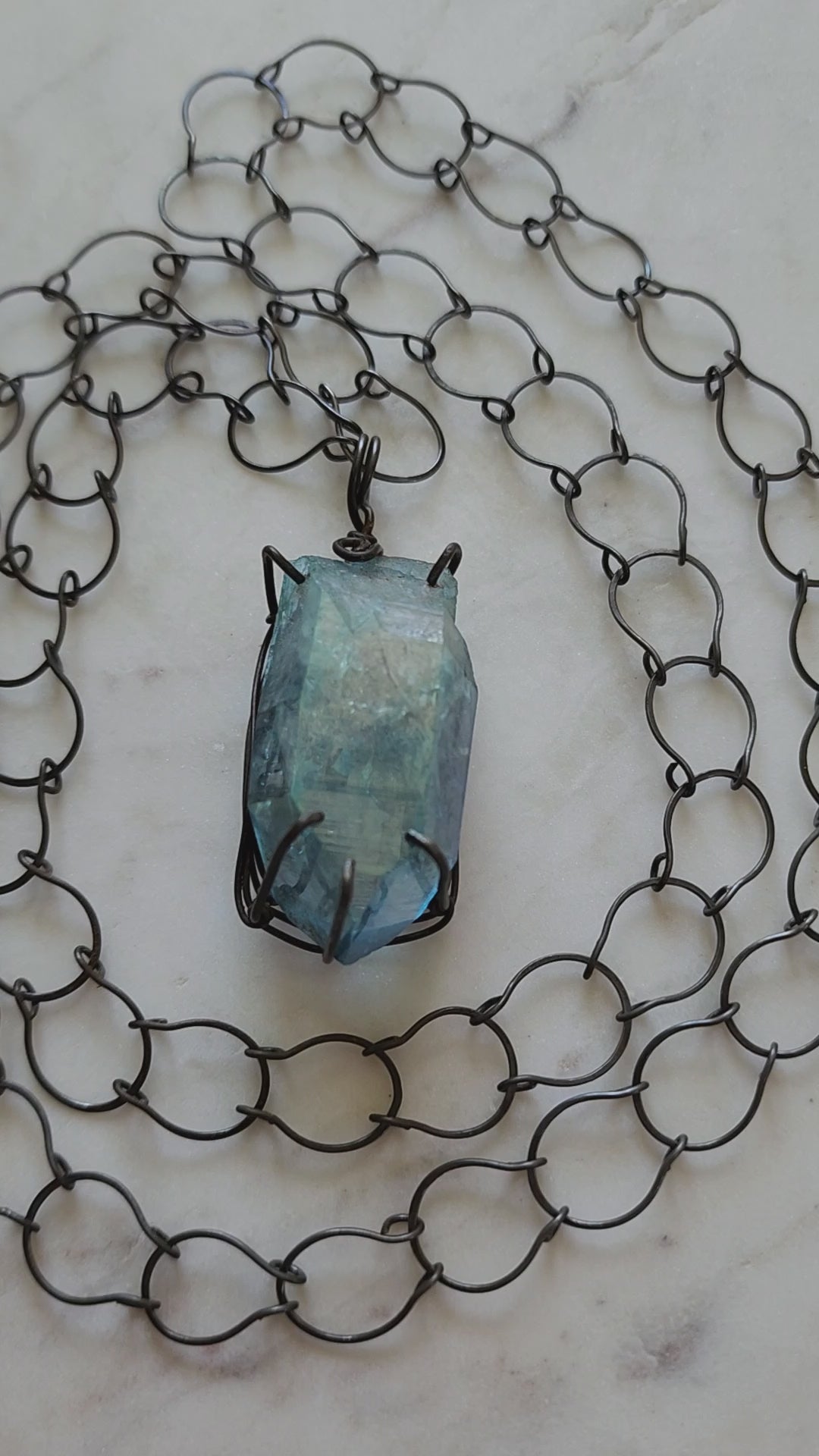 - Pendant: wrapped aqua aura crystal secured in oxidized iron