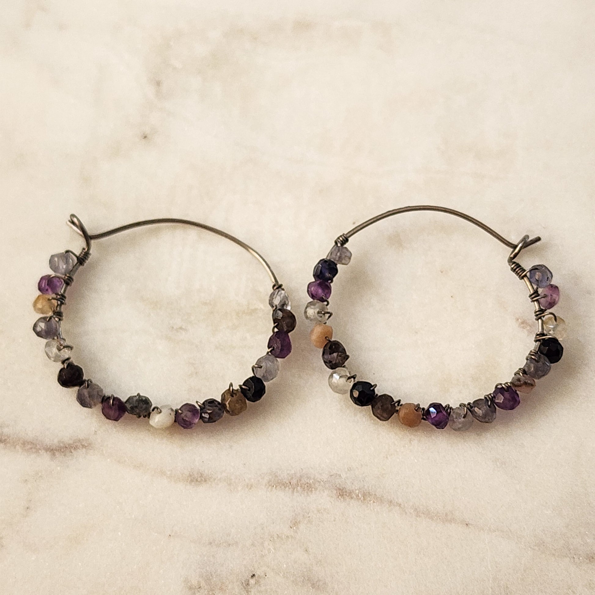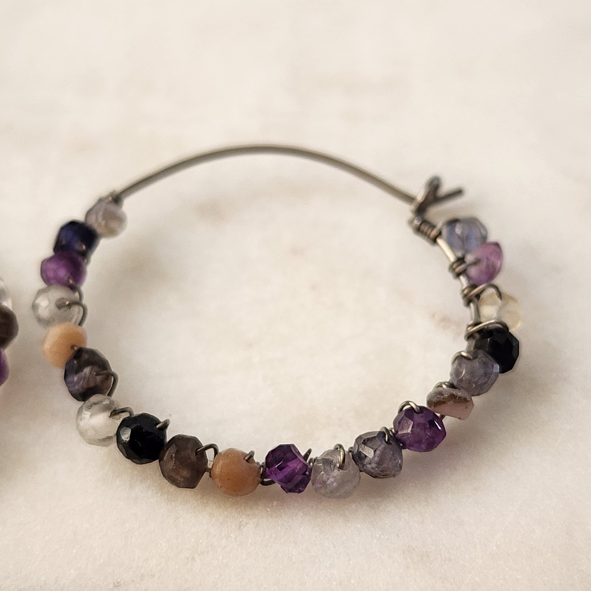 Tiny faceted beads of natural zircon—plum, lilac, champagne, smoke, and clear—are hand-wrapped along sleek titanium hoops. They sparkle like embers at dusk and feel nearly weightless, making them an easy, luminous staple.