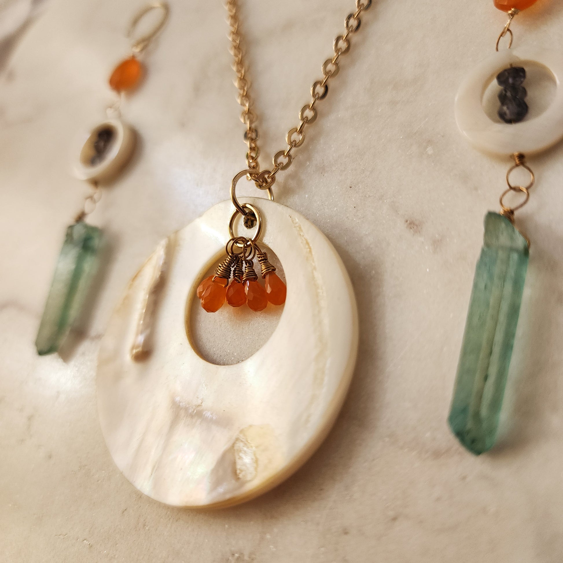 The Solstice Tides Set evokes a meeting of the elements—where fiery carnelian kisses the sea-swept shimmer of shell, and cool aqua quartz hums with stillness and spirit. This two-piece jewelry set includes a glowing statement necklace and a pair of elegant drop earrings, handcrafted for those who carry the rhythm of both sun and sea within them.