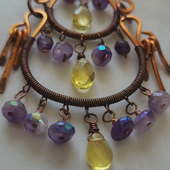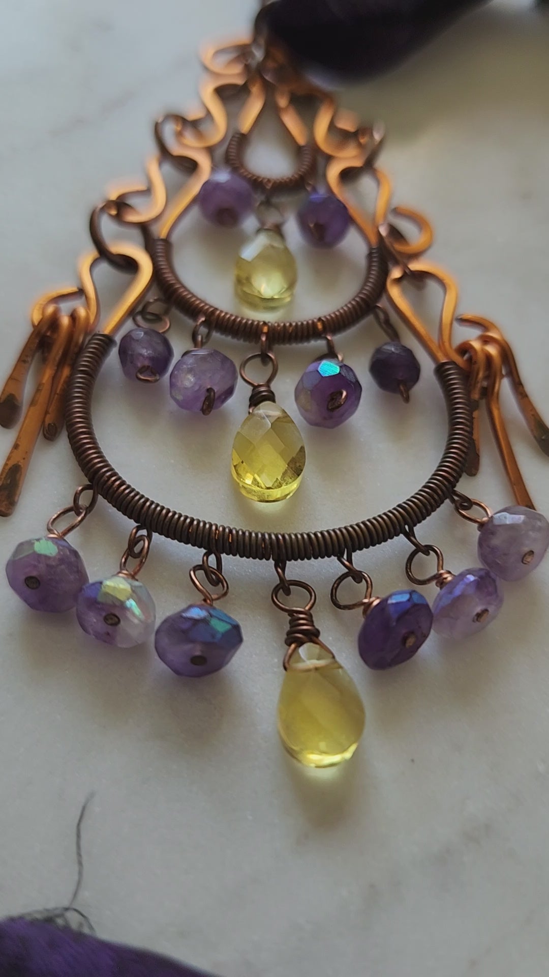 Alive with motion and light, the Twilight Ember Necklace captures the essence of flame dancing through dusk. Its handcrafted copper pendant moves gently as you do, each loop adorned with twelve faceted mystic amethyst and three golden citrine teardrops that shimmer like sparks beneath twilight skies.